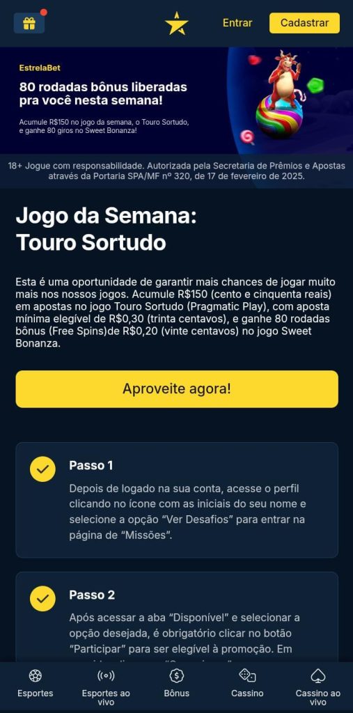 No cassino Estrelabet, você tem direito a ganhar rodadas grátis através do Jogo da Semana. Para ganhar, é só apostar um valor mínimo no jogo elegível. Para saber quais os valores e os slots do momento vá até a página de ofertas.